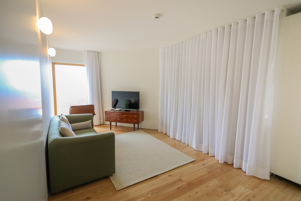 Uma suite, moderna e sofisticada, adequada para famílias.