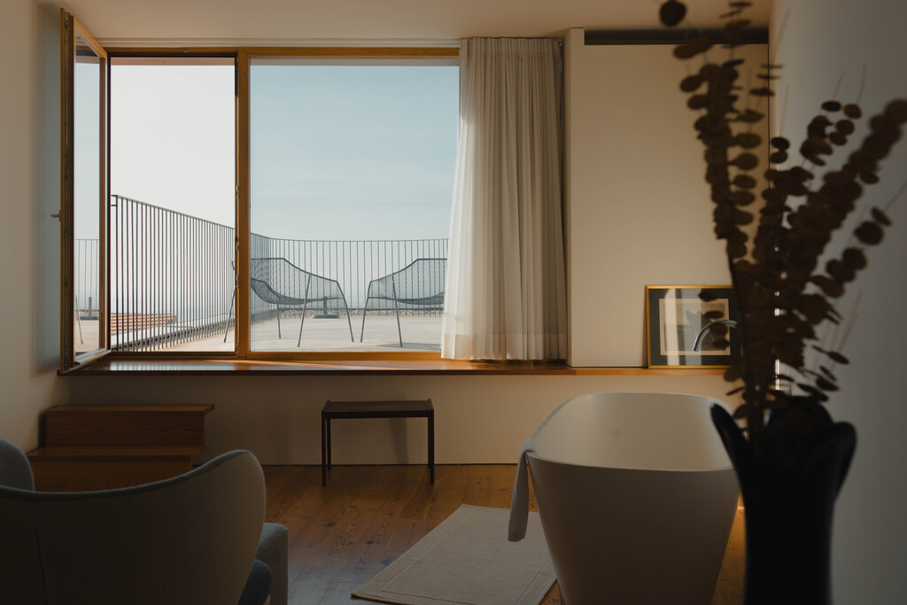 Junto ao spa, uma suite duplex, com banheira panorâmica e terraço privativo com vistas únicas.